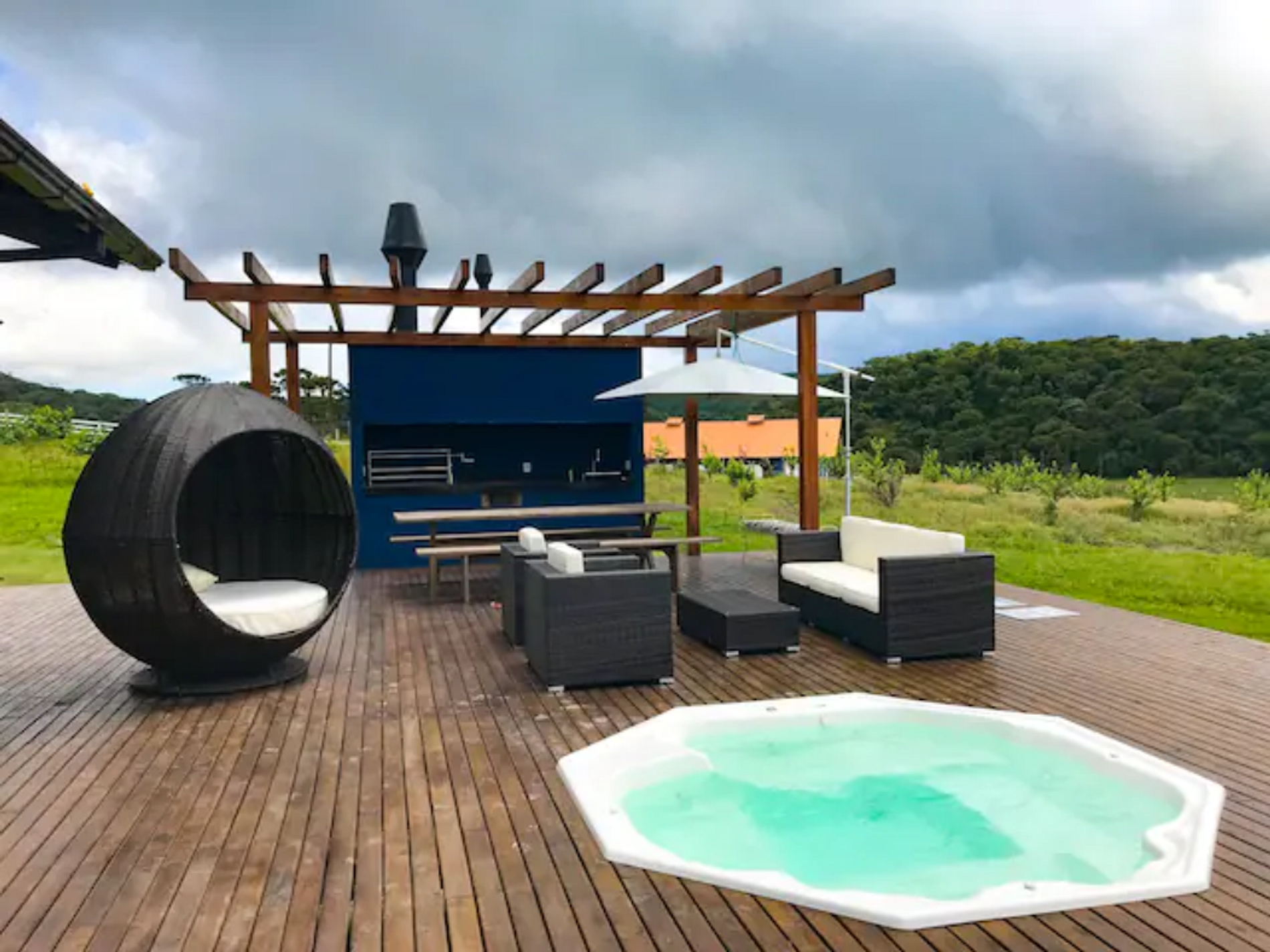 A casa Lavanda conta com 4 quartos, 2 banheiros e lavabo, sala, cozinha, amplo deck com jacuzzi e área de churrasqueira.